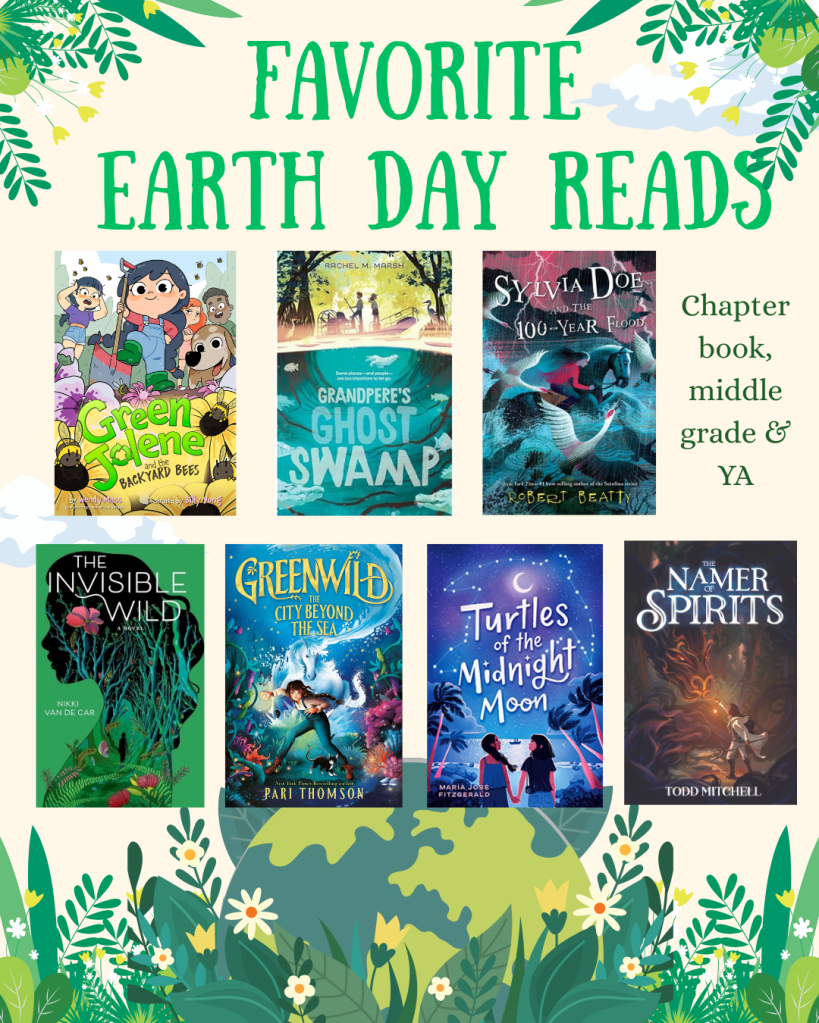 Green Jolene and the Backyard Bees by Wendy Mass This newish (first in the series released around Earth Day last year) upper chapter book series about “Jolene, a can-do hero who is discovering how to take an Earth-first approach to every problem she encounters.”